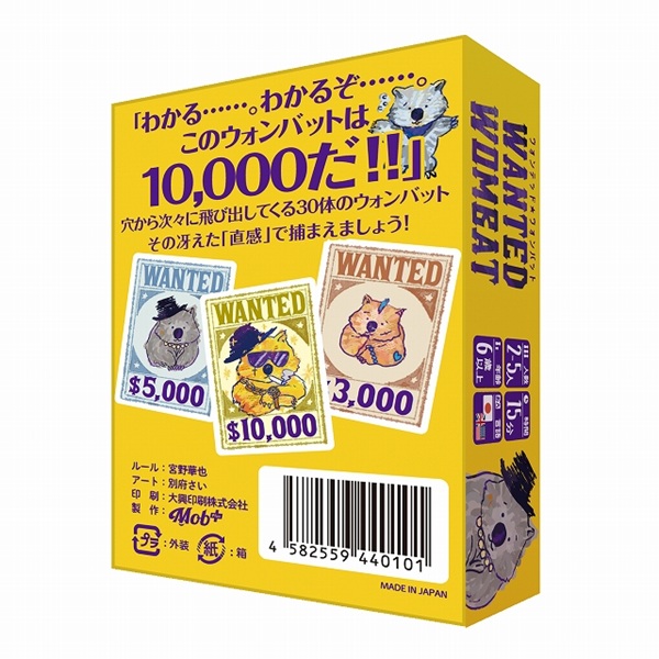 | 商品内容 | わかる…。わかるぞ…。あのウォンテッド・ウォンバットが進化したんだ! 出てくる数字を予想して山札をめくり、当たっていたらカードを獲得できる。そんな簡単すぎるルールなのに、気が付いたら大熱狂間違いなし。 その秘密は山札にひそんだウォンバットたちの「出てくる確率」です。一番低い懸賞金の千バットは16枚も入っていて、一番高い万バットはたった2枚だけ。 じゃあ千と言えば良いだけじゃないか……と思えば、いきなり登場の万バット!それなら……万バット! と宣言すると、出てくるのは千バットばかり……。 でも、逃げていたウォンバットは記録されていくので、当たる確率はどんどん変わっていきます。しかも万バットは外しても逃げず、巣穴(山札)に帰っていくのです。 まるで生きているかのように宣言をかわしてくる山札に、他の人たちは抱腹絶倒。めちゃくちゃ盛り上がるパーティゲームの新定番です。 日本のボードゲーム界隈で人気のイラストレーター「別府さい」さんのアートワークが魅力です。 ■第二版のポイント■ ①マニュアルが読みやすくなり、英語マニュアルも付属! ②一部のカードが金の箔押し仕様となり、更にゴージャスに! プレイ人数:2〜5人/プレイ時間:15分/対象年齢:6歳以上 |