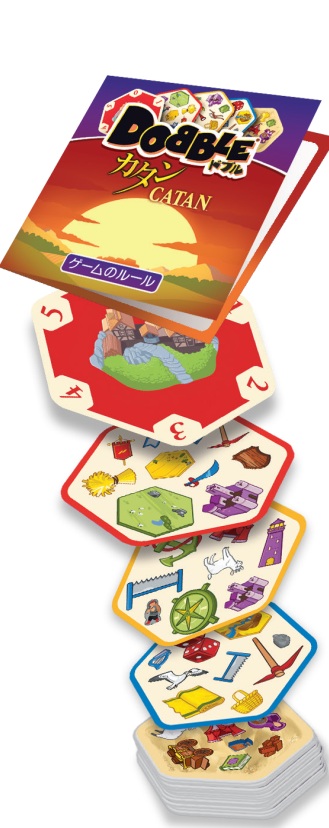 | 商品内容 | カタン島で一番先に同じものを見つけるのは誰だ? 『ドブル:カタン』は、個人戦とチーム戦があり、全員が同時にプレイします。カードを出すには、すでに場に出ているカードと共通するシンボルを最初に見つけてその名前を宣言します。相手に同じことをされる前に、自分のカードで相手をブロックしよう! 1つの箱に5つのゲーム 『ドブル:カタン』は全てのプレイヤーが同時に行動する、素早さが重要な5つのミニゲームが集まったゲームです。ミニゲームは好きな順番に遊んでも、同じものを何度も遊んでも構いません。重要なのは楽しむことです! ゲームはリアルタイムで進行していきます。スピード、観察力、そして反射神経を競って、にぎやかにミニゲームを遊ぶ、ファミリーでも楽しめるパーティーゲームです。 プレイ人数:2〜6人/プレイ時間:約15分/対象年齢:8歳以上 |