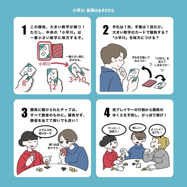 | 商品内容 | 2025年の新版では、デジタルゲーム「レッツプレイ!オインクゲームズ」に採用されている新ルールのほか、新しいコンポーネントが追加されました。 メダルを賭け、自分の手札が一番大きければ勝ち!ただし、場の中央に置かれた《小早川》と呼ばれるカードがクセモノ。小早川は一番小さい数字にプラスされるので、大きい数字のカードを持っていたからといって必ず勝てるとは限りません! シンプルなルールながら、度胸とハッタリが試される、短時間で熱く盛り上がれるカードゲームです。 従来のルールでは、勝負に挑んだ時のみメダルを賭けることができましたが、最新版「小早川」では「勝負を降りた人も誰が勝つか予想してメダルを賭ける」という新しいルールが追加されました。 プレイ人数:3〜8人/プレイ時間:約20分/対象年齢:8歳以上 |