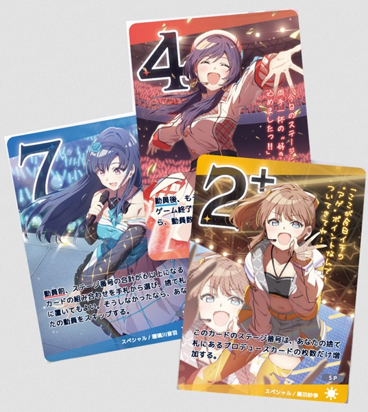 | 商品内容 | 目指せ、動員数No.1! 想いがぶつかるステージバトル! 若手アイドルの登竜門「スターリーチフェスティバル」が開幕! あなたは担当アイドルとともに、7回のステージで動員数No.1を目指します。 アイドルの個性と待機列の状況、そして「ステージ破り」にも注意して、担当アイドルを将来のスターの座に導きましょう! 大人気アイドルLCG『アイドルアライブ』にスピンオフ作品が登場! ゲームデザイナーに『ラブレター』のカナイセイジ氏を起用。 最大5人まで遊べるライトゲームながら高いリプレイ性を持ち、『アイドルアライブ』ファンのみならず、広く楽しめるカードゲームです。 プレイ人数:3〜5人/プレイ時間:20分/対象年齢:10歳以上 |