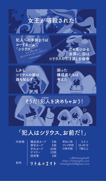 | 商品内容 | ここは錬金術が繁栄する国アルテミス。 ある夜、女王が暗殺された。 現場に残されたのは一つの紋章と、謎めいたコードネーム――「シリウス」。 新たに即位した女王は高らかに布告する。 「組織からシリウスを差し出せ。従わぬならば全員を裁く」と。 しかし組織の誰も、その顔も素性も知らない。 追い詰められた構成員たちは互いを探り合い、やがて一人に罪を押し付けるしかないと決断する。 真実が分からぬなら――そうだ、犯人を決めちゃおう! 犯人はシリウス!お前だ! 「犯人はシリウス」は、女王暗殺を行った正体不明の「シリウス」を構成員たちで押し付け合うゲームです。 自身が抱える罪を隠しつつ、他構成員の罪状を暴き、罪をなすりつけましょう! プレイ人数:3~5人/プレイ時間:10~20分/対象年齢:7歳以上 |