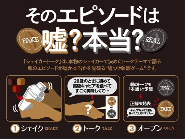本物のシェイカー でサイコロを振ってトークテーマを決めたら、親はそのお題に沿ってエピソードをトーク!